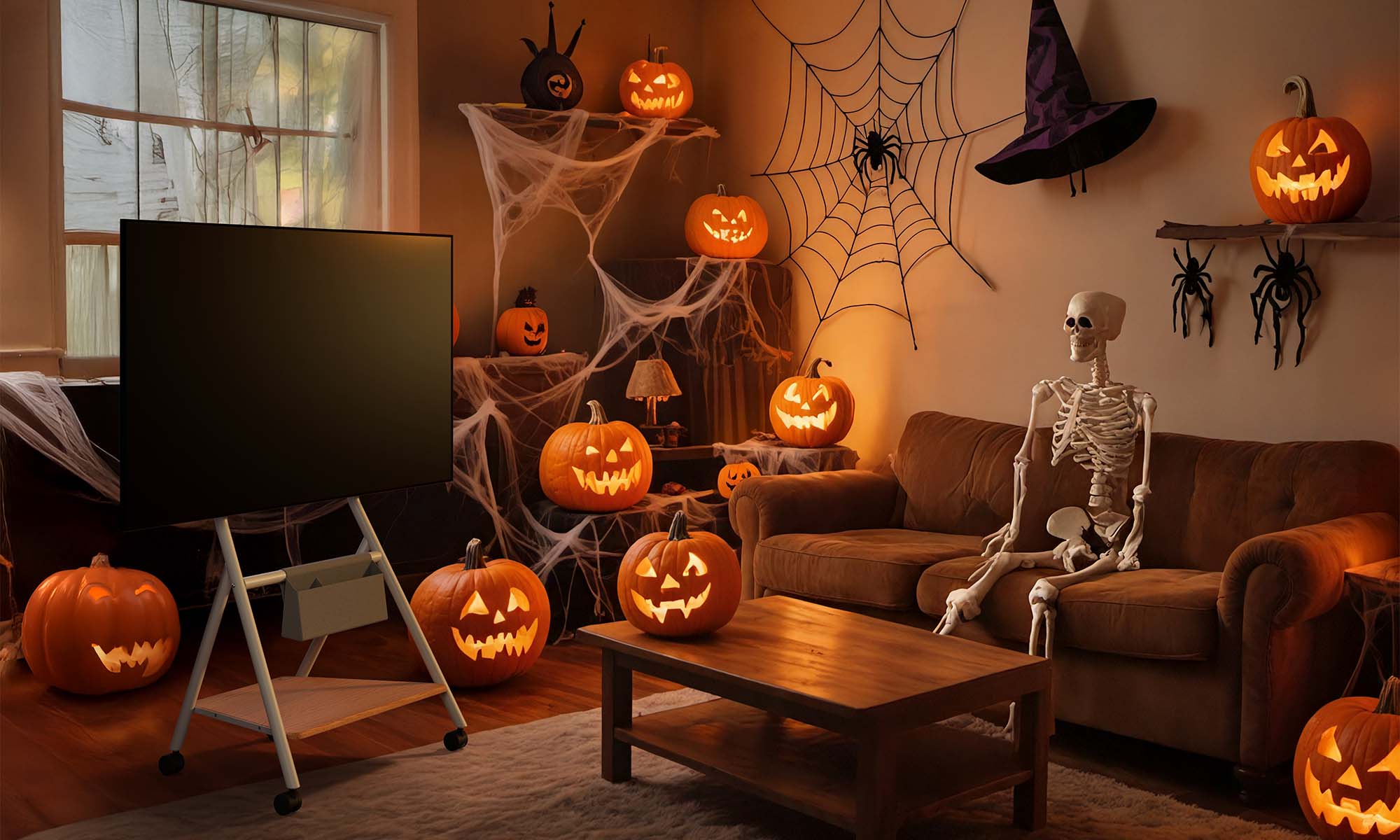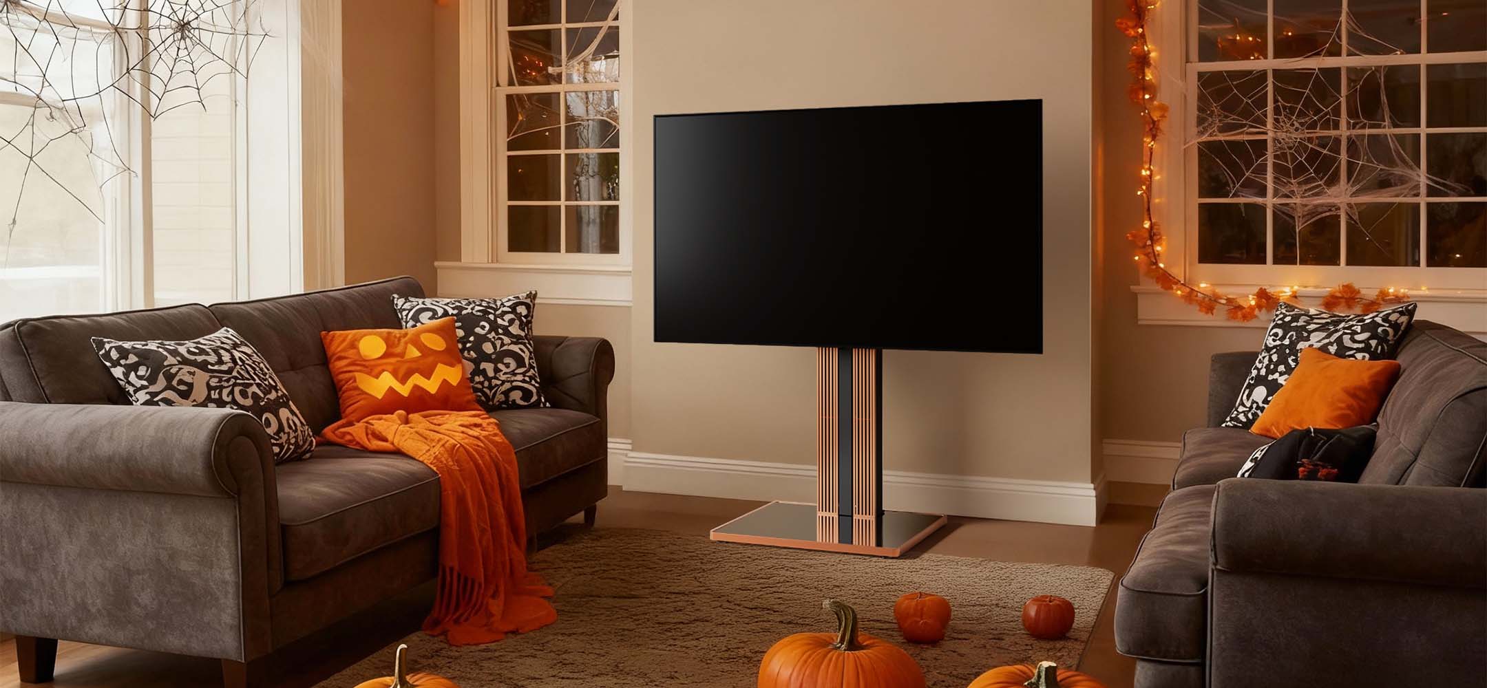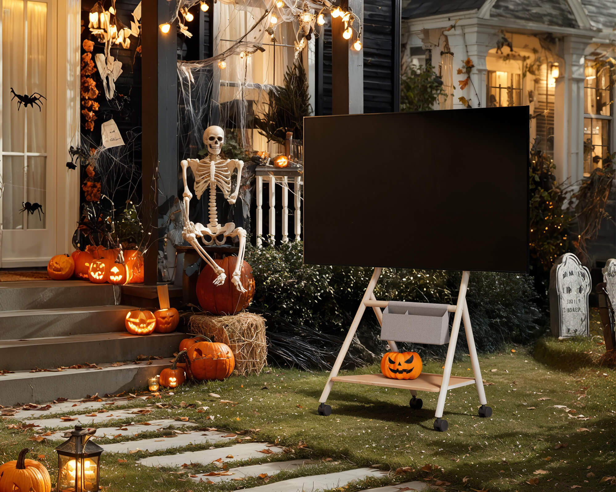 With a movable TV stand, your Halloween cinema follows you — from the living room to the garden, from cozy indoors to the open night sky.