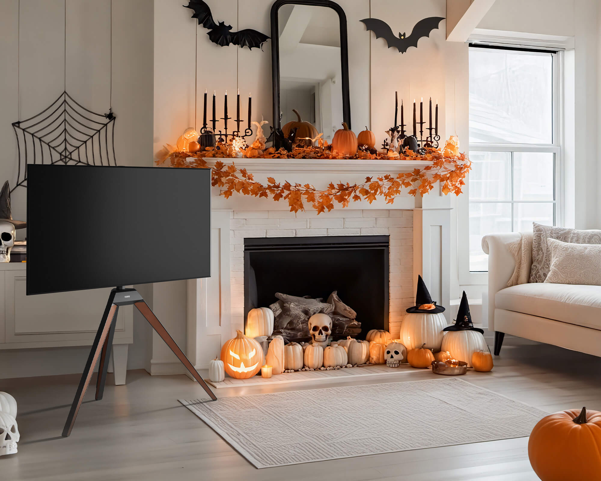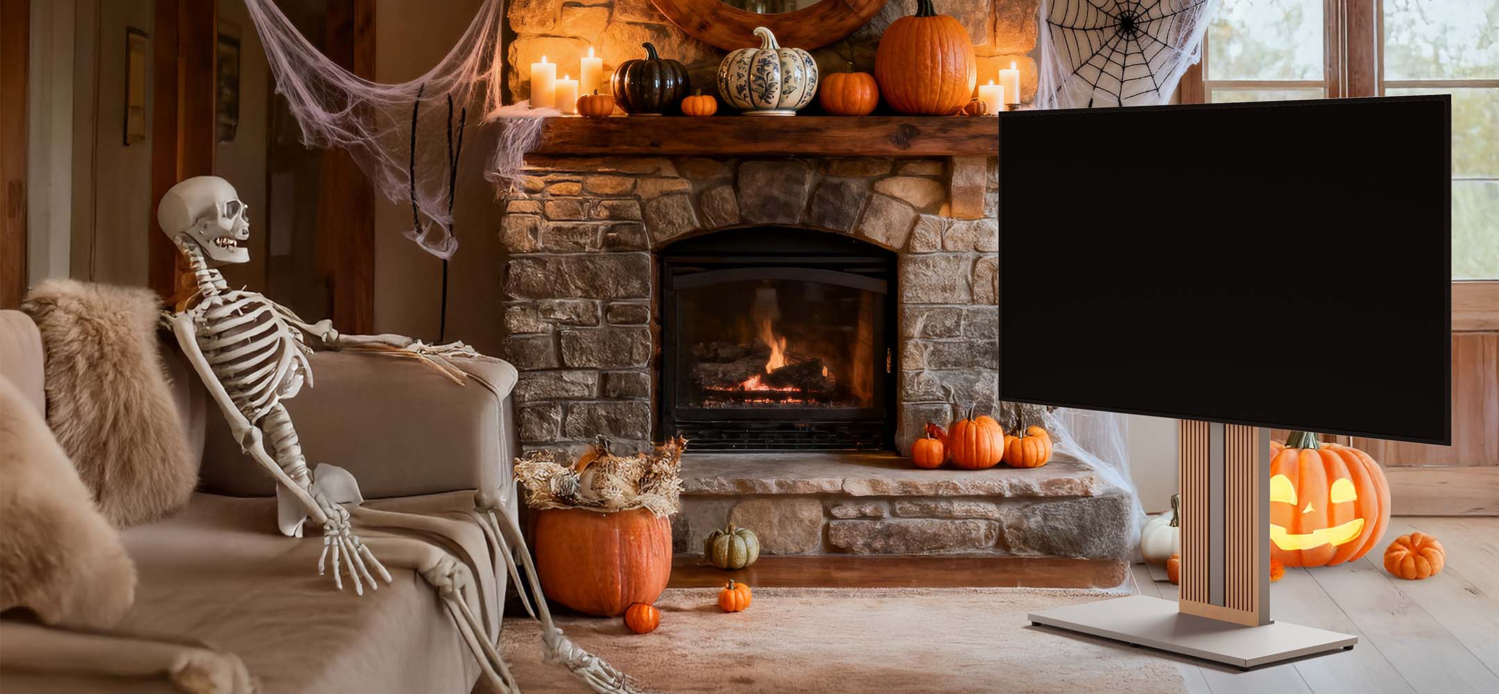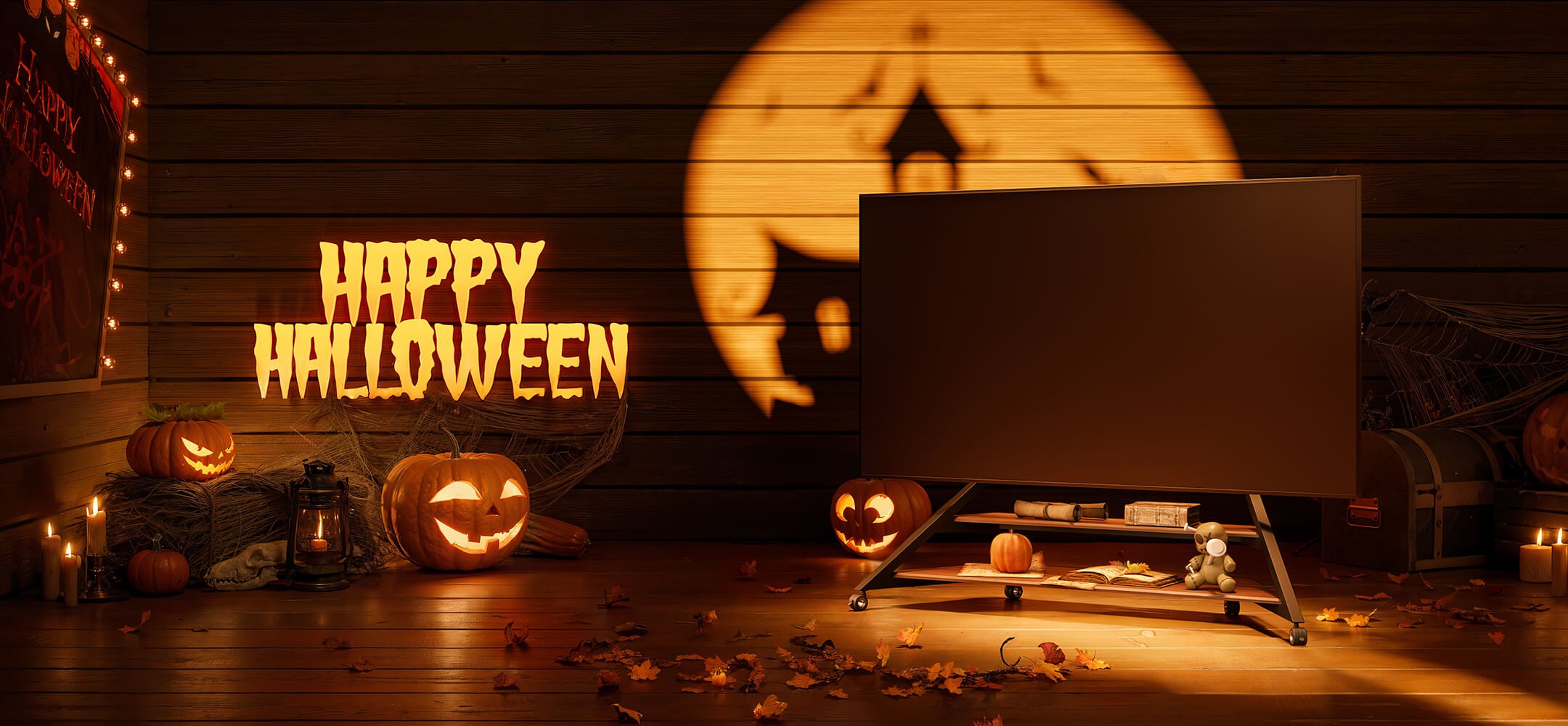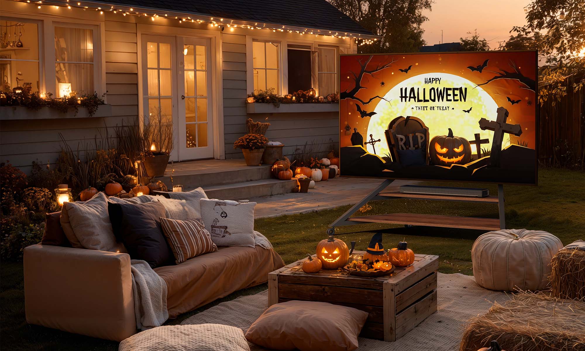 With a movable TV stand, your Halloween cinema follows you — from the living room to the garden, from cozy indoors to the open night sky.