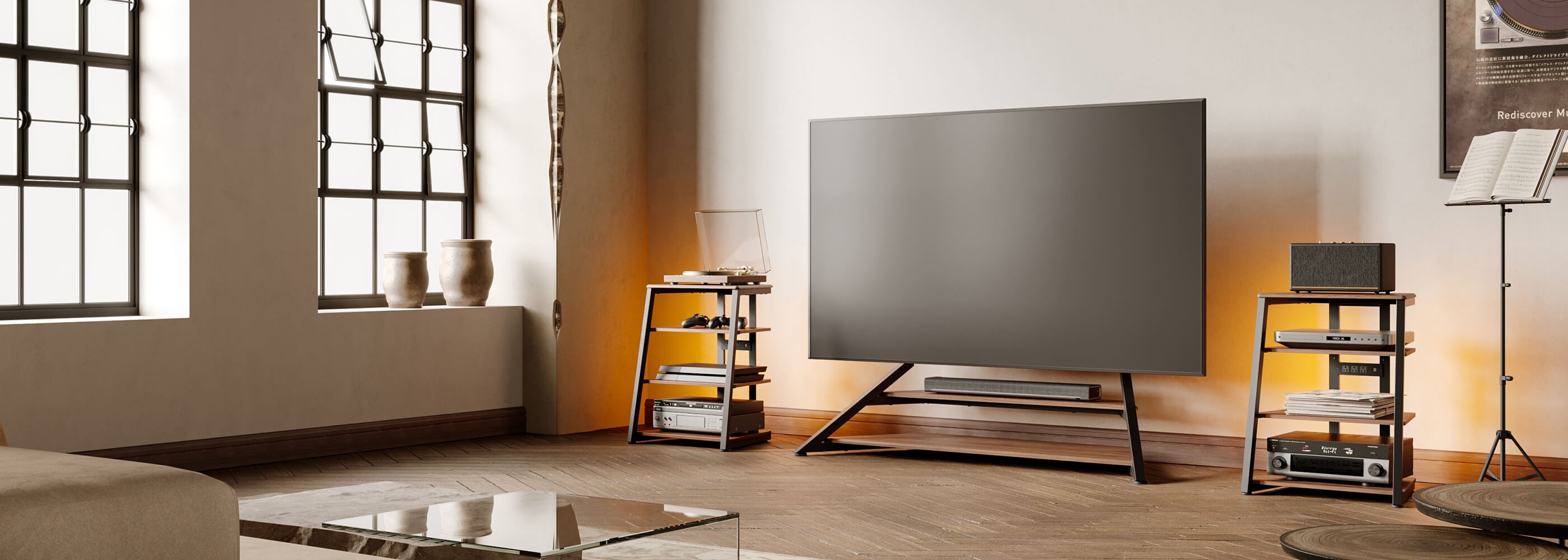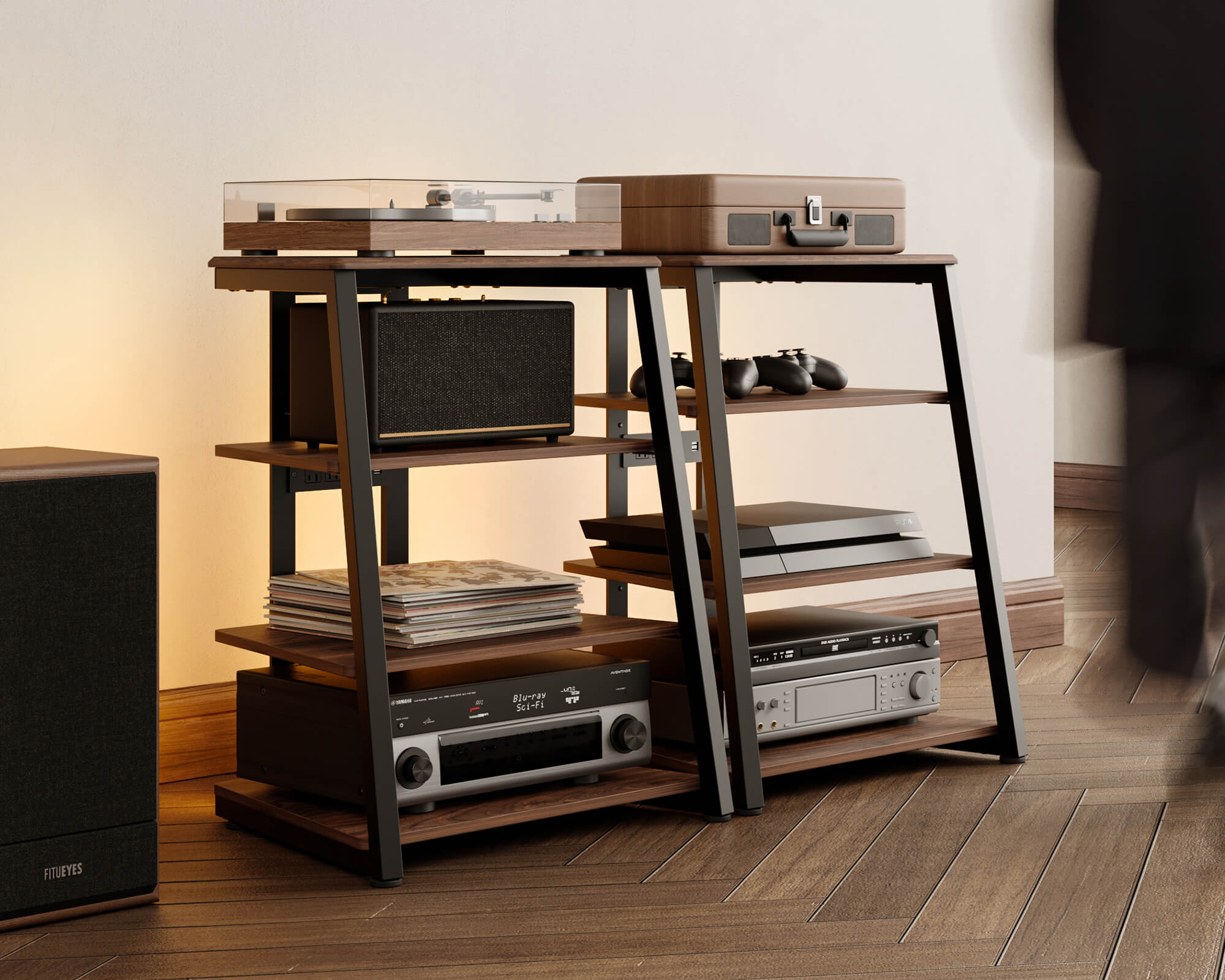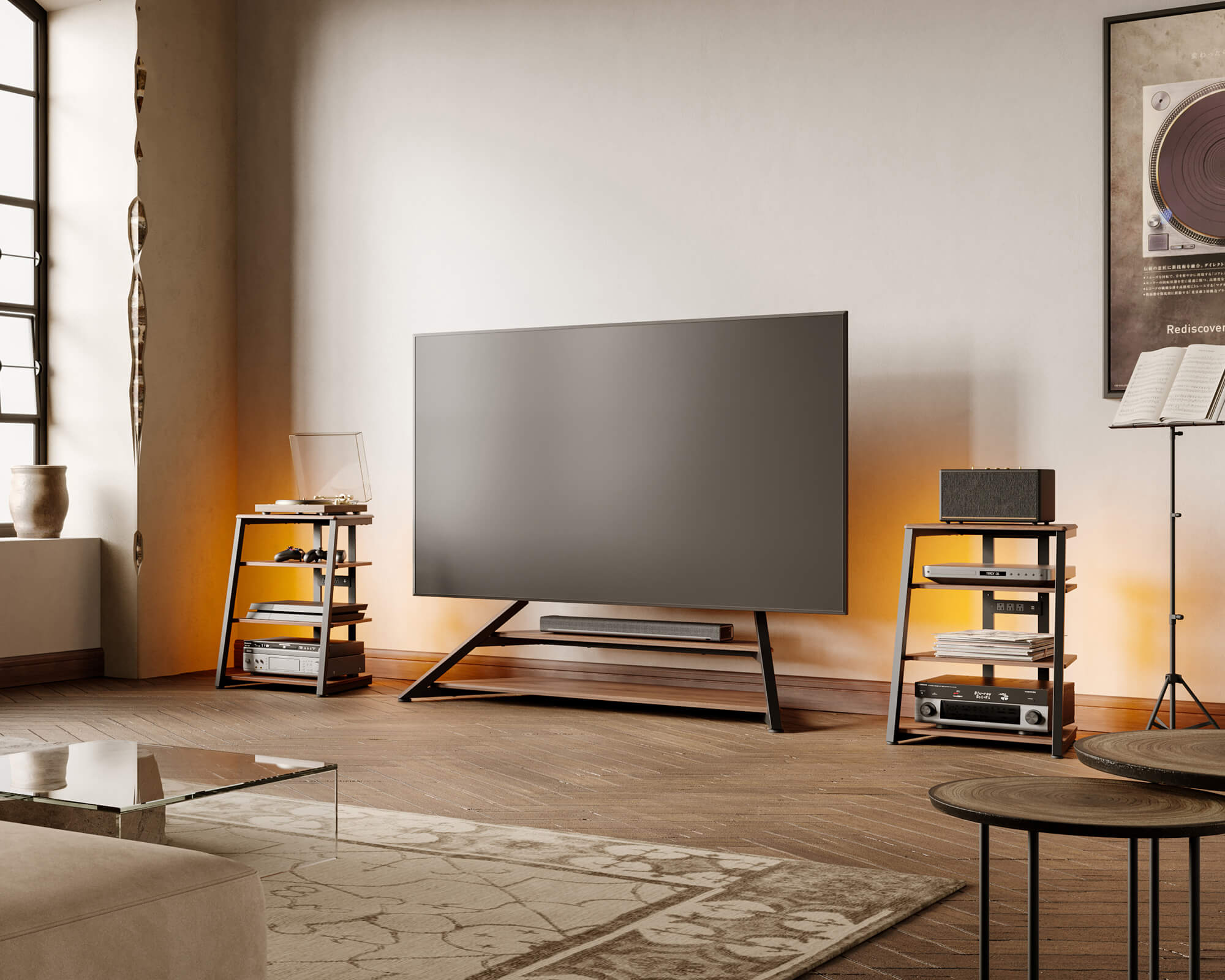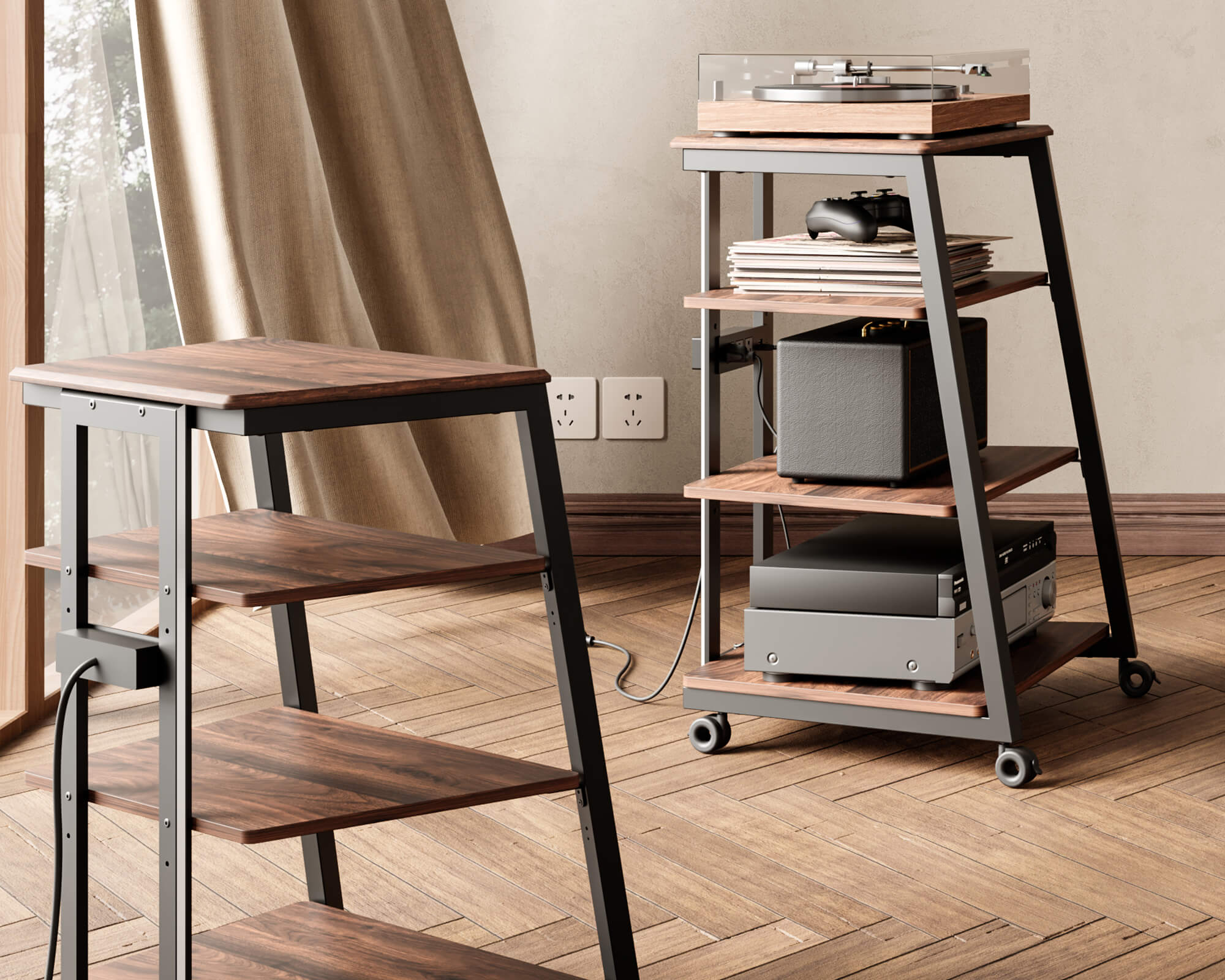 This Audio Rack can be fitted with wheels with brakes. Say goodbye to traditional bulky audio racks and embrace a minimalist, intuitive audio experience.
